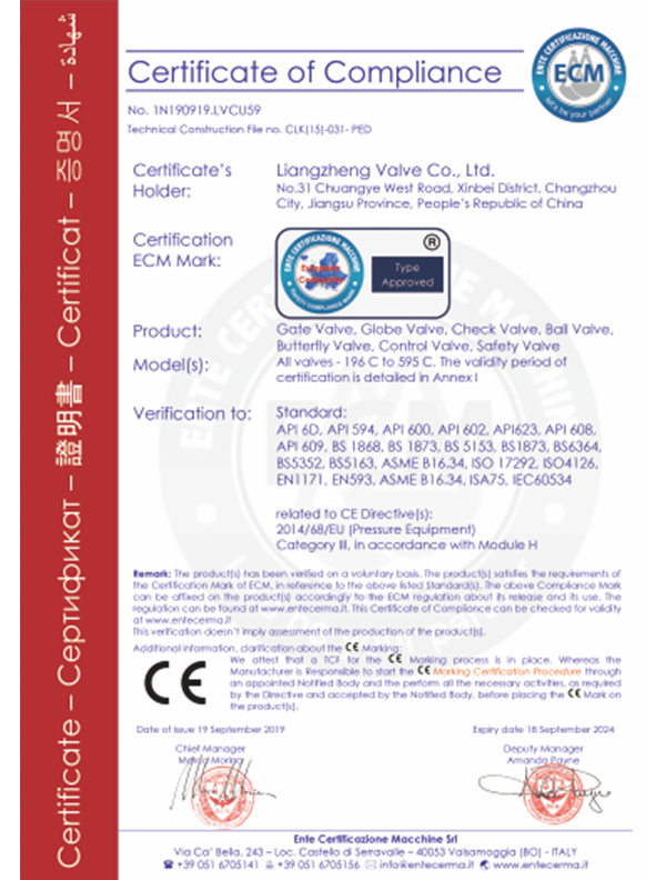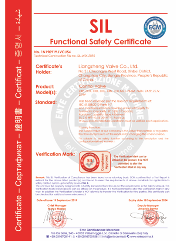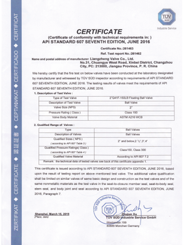 良正閥門均通過了”TS”特種設備制造許可A級認證,API6D美國石油協會認證,ISO9001國際質量體系認證,ISO14001環境體系認證,ISO45001職業健康安全管理體系認證,德國南德TUV頒發的API607防火認證,SIL3安全評估證書,CE歐盟證書,兩化融合證書,知識產權貫標證書,AA計量、AAA測量體系等證書。